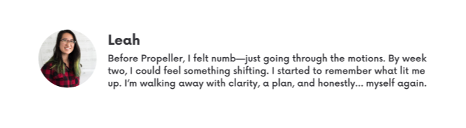 Whether you're in a moment of burnout, quiet transition, or bold ambition—Propeller meets you exactly where you are, and helps you rise from there.